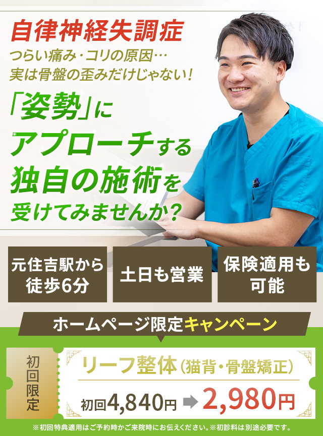リーフ・かなで整骨院グループのリーフ整骨院 元住吉院では、自律神経失調症でお悩みの方が多く来院されて、改善している事例が数多くあります。